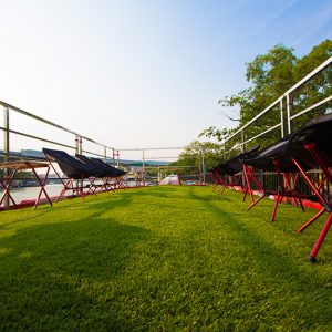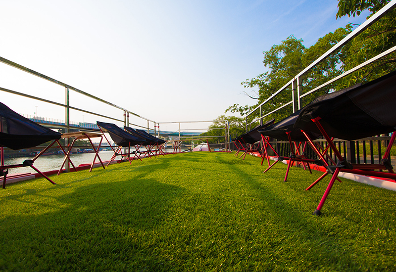 足元には一面の芝生が広がり、船上であることを忘れさせてくれます。1階インドアスペースは冷暖房・カラオケ完備でラグジュアリーにくつろげます。